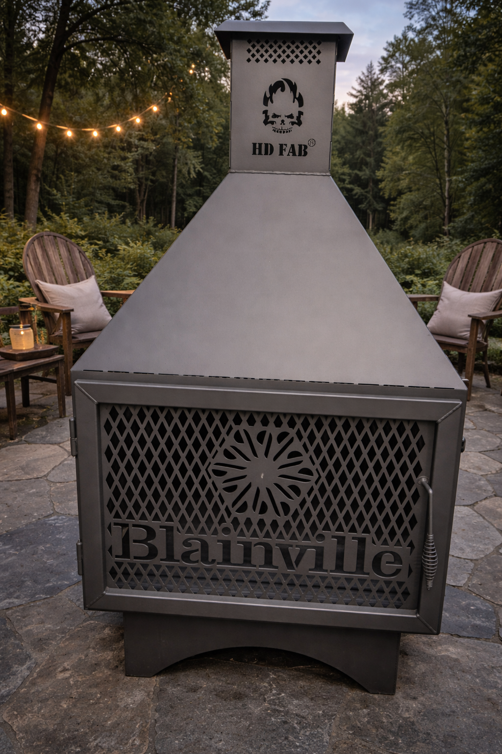 Foyer extérieur de qualité commercial / Modèle disponible : 25",30",36",50" et 60" Grille unique custom HDFAB® entièrement dessinée et découpé au laser dans la plaque d'acier qui forme le foyer.